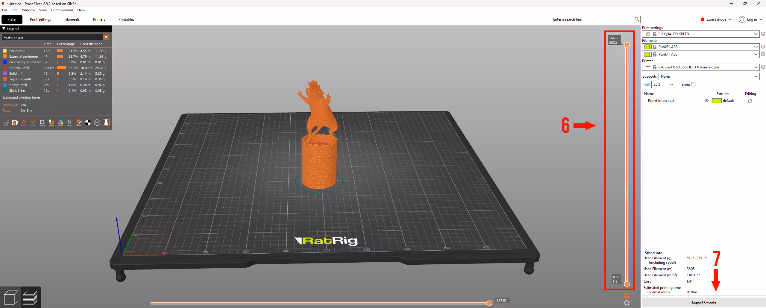 This feature helps identify potential geometry constraints that may need adjustments in the print settings. Simply drag the toggle up and down to review the layers. While this step is not required for printing, it is a useful habit as you become more familiar with slicer settings. Once satisfied, click "Export G-code" (7) to generate the print file. Then, upload it to Mainsail, and you're ready to start printing!