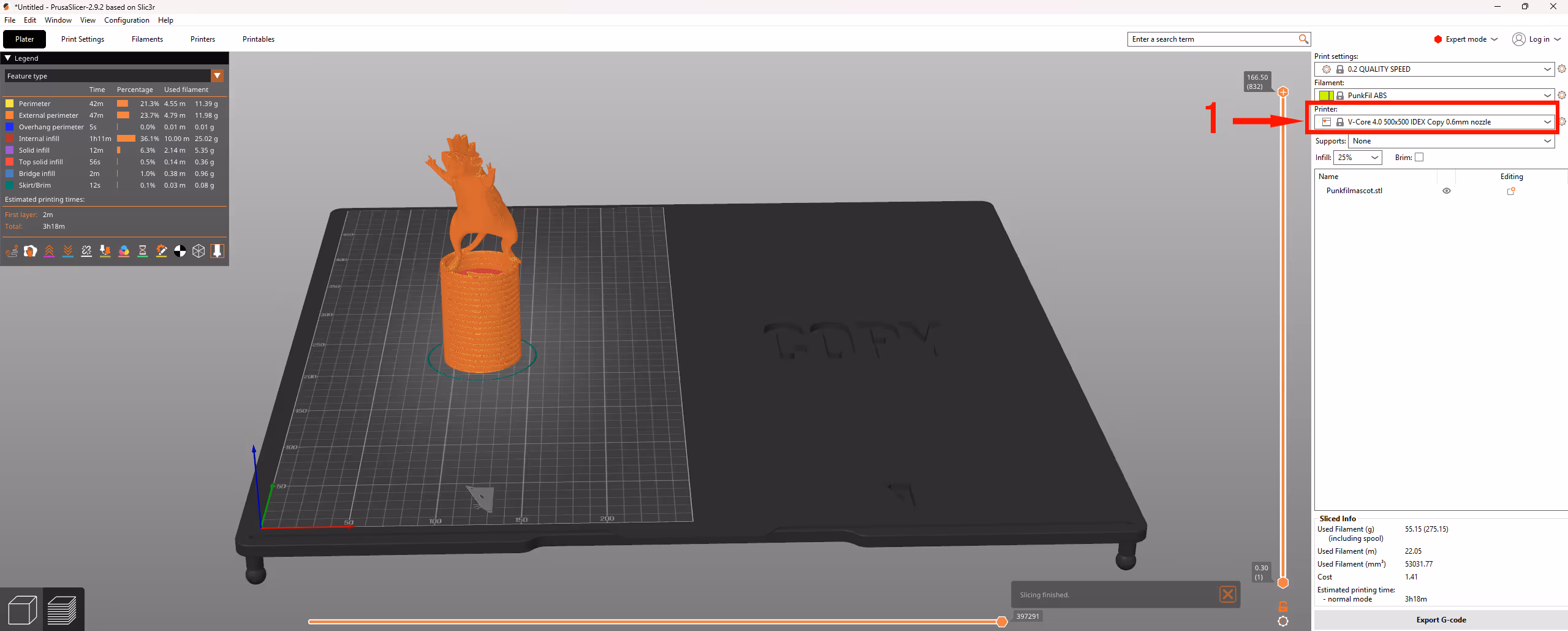 Note!When you select either Copy Mode or Mirror Mode, you’ll notice that your build plate changes. This allows you to see the exact area available for printing in Copy or Mirror mode.From this point on, the slicing process will be the same as for a normal single-toolhead print. - Now you’re ready to export your G-code.